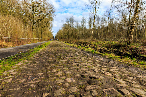 View of the famous cobblestone road (Arenberg gap) located in the forest of Raismes-Saint-Amand-Wallers in North of France. On such roads every year is organized the one day cycling race Paris-Roubaix.